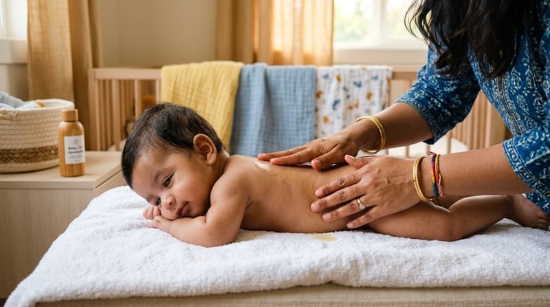 A morning massage with lighter strokes wakes up the baby gently and stimulates blood flow before the day begins. The afternoon is a good time for tummy massage to relieve gas and aid digestion after a feed. The most popular slot is before the night bath: a slow, calming massage followed by a warm bath, feed and dim lights builds a strong sleep cue. Stick to one fixed time daily so the baby starts anticipating it.